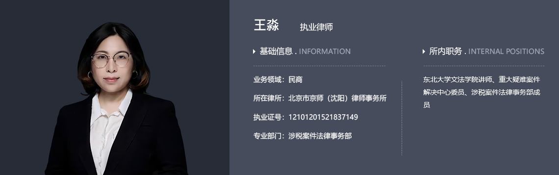 北京市京师(沈阳)律师事务所兼职律师、东北大学文法学院讲师、重大疑难案件解决中心委员、涉税案件法律事务部成员