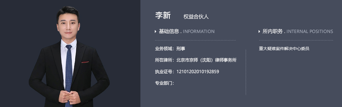 北京市京师(沈阳)律师事务所合伙人、重大疑难案件解决中心委员、执业律师。毕业于辽宁警察学院,公安管理专业,获取中国人民公安大学 公安学(法学)学士学位