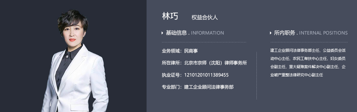 2021年4月-至今 北京市京师(沈阳)律师事务所建工企业顾问法律事务部主任、合伙人、公益委员会活动中心主任、农民工帮扶中心主任、妇女委员会副主任、重大疑难案件解决中心副主任、企业破产重整法律研究中心副主任、执业律师
