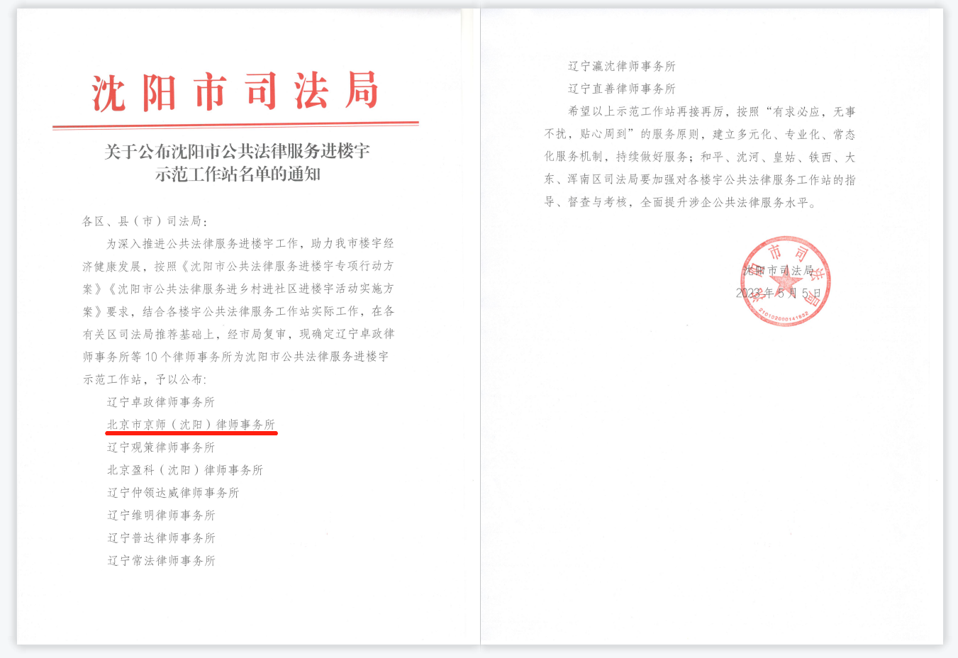 2023年5月5日,沈阳市司法局公布了公共法律服务进楼宇示范工作站名单,北京市京师(沈阳)律师事务所(简称京师沈阳律所)被沈阳市司法局确定为沈阳市公共法律服务进楼宇示范工作站。