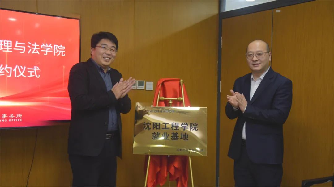 座谈交流后,举行了签约仪式。北京市京师(沈阳)律师事务所执行主任王辰与沈阳工程学院经济管理与法学院院长安玉兴教授代表双方签署了实践实习基地合作协议书。院长安玉兴教授为实践实习基地——北京市京师(沈阳)律师事务所揭幕授牌。