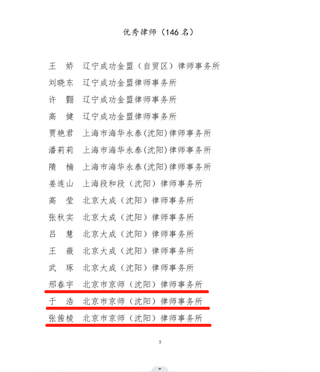 近年来,全市律师行业坚持以习近平新时代中国特色社会主义思想为指导,深入学习贯彻习近平法治思想,紧紧围绕沈阳市加快建设国家中心城市工作大局,充分发挥律师职能作用,为经济社会发展提供了优质高效的法律服务和坚强有力的法治保障,涌现出了一批先进典型。为表彰先进、弘扬正气,进一步激励全市律师在新征程上抢抓新机遇、再创新业绩,沈阳市律师协会印发关于表彰“2021-2022 年度沈阳市优秀律师事务所 优秀律师”的决定公告文件。北京市京师(沈阳)律师事务所邢春宇律师、于浩律师、张茜棱律师位列其中,荣获“2021-2022年度沈阳市优秀律师”称号。